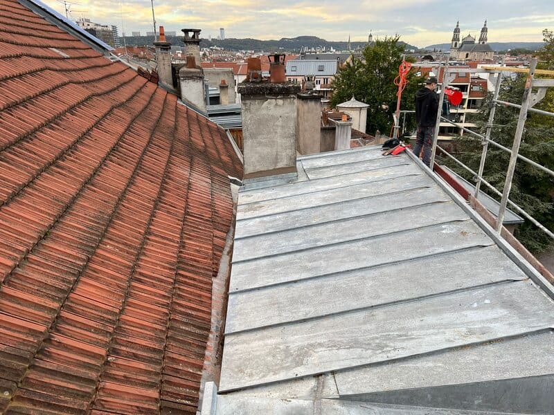 Présentation de ce projet de réalisation d’une couverture en zinc naturel à joint debout avec tablettes de fenêtre sur-mesure et abergement d’une cheminée à Nancy
