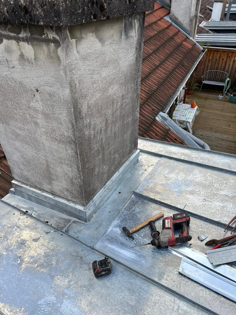 Réalisation d’une couverture en zinc naturel à joint debout avec tablettes de fenêtre sur-mesure et abergement d’une cheminée d’immeuble d’habitation à Nancy