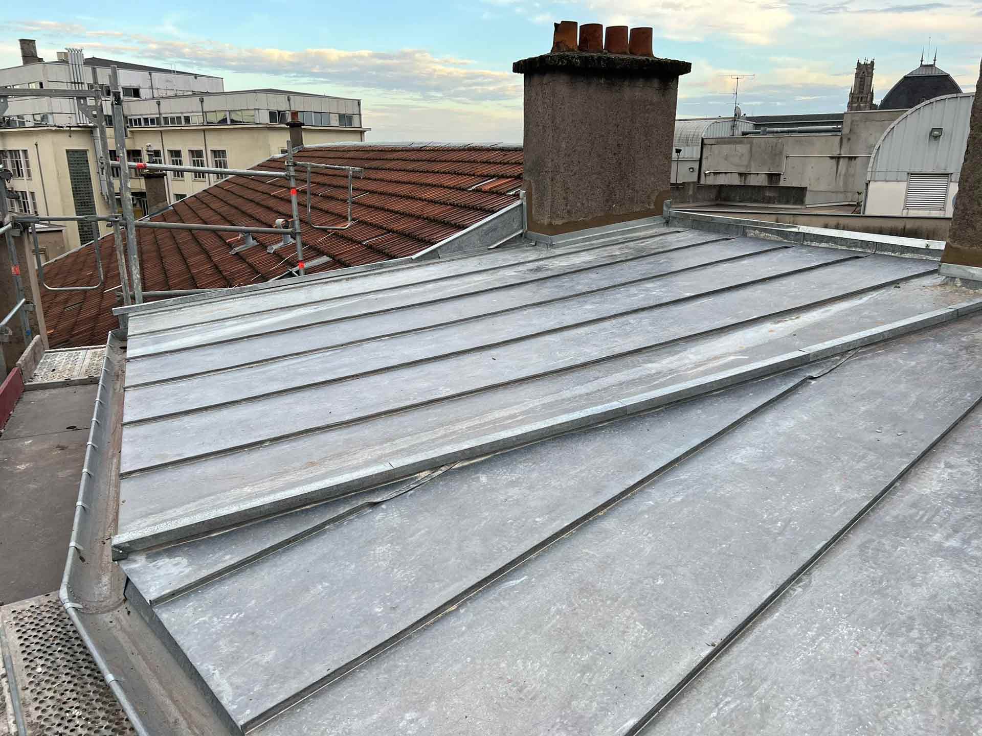 Équipements utilisés pour cet immeuble d’habitation à Nancy : Feuilles de zinc naturel, bandes de rive, pièces de raccord et éléments spécifiques à la cheminée façonnés
